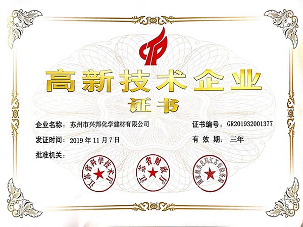 興邦擁有經(jīng)驗(yàn)豐富的高水平科研技術(shù)團(tuán)隊(duì),完整的科研管理體系,及完善的科研測試硬件設(shè)備。良好的軟硬件條件和持續(xù)的科研投入帶來累累碩果,興邦產(chǎn)品和為客戶提供的配方開發(fā)支持獲得客戶一致好評,累計獲得授權(quán)的發(fā)明專利超13件、實(shí)用新型超4件,累計參與國家、行業(yè)及團(tuán)體標(biāo)準(zhǔn)超20項(xiàng)。與此同時,興邦自2016年被首次認(rèn)定為高新技術(shù)企業(yè)以來,已經(jīng)連續(xù)三次順利通過高企審核。公司技術(shù)研發(fā)中心被認(rèn)定為“蘇州市綠色節(jié)能建筑材料工程技術(shù)研究中心”、“蘇州市企業(yè)技術(shù)中心”、“江蘇省無機(jī)膠凝材料外加劑工程技術(shù)研究中心”等等。
